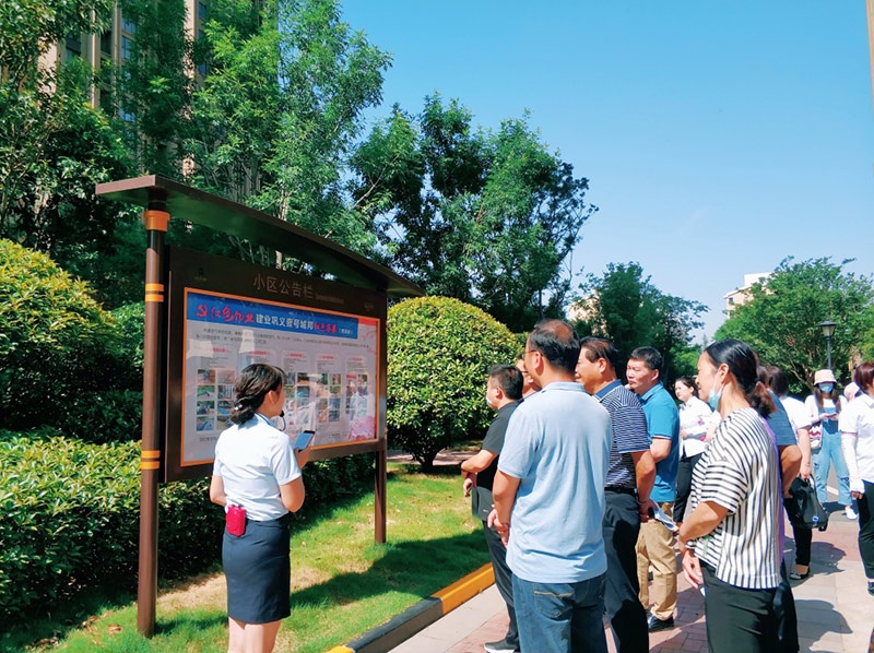 考察組一行先后參觀了鞏義·建業(yè)壹號城邦黨建墻、企業(yè)文化墻、紅色活動公示欄,并在項目大廳做溝通交流。鞏義·建業(yè)壹號城邦物業(yè)黨支部充分發(fā)揮黨建引領(lǐng)基層社會制理作用,積極探索推進社區(qū)與物業(yè)管理工作的有機融合,著力打造“紅色物業(yè)”,推動社區(qū)共建、共治、共享,考察組對其社區(qū)治理格局表示高度認(rèn)可。