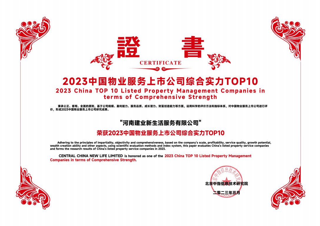 建業(yè)新生活榮膺“2023中國物業(yè)服務(wù)上市公司綜合實(shí)力TOP10”!