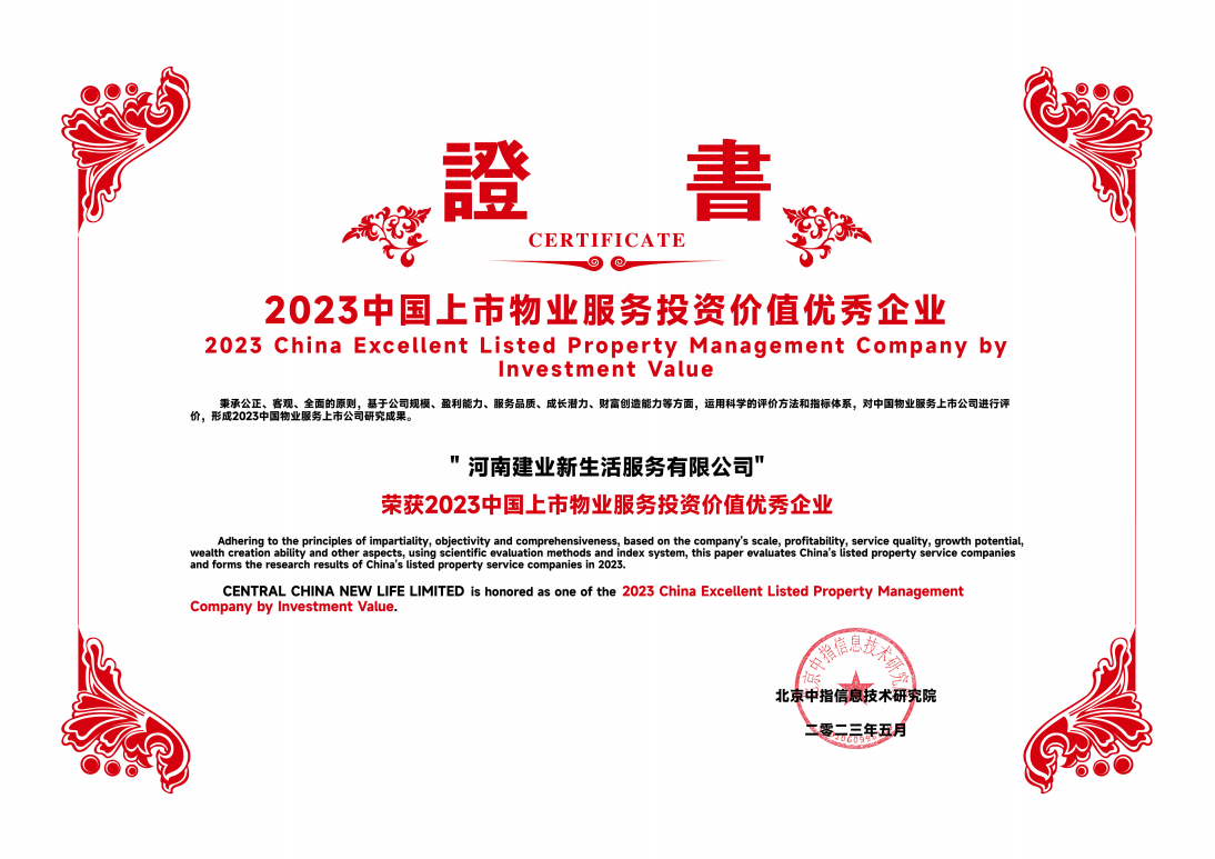 自2020年上市以來,建業(yè)新生活不斷拓展服務(wù)邊界,憑借持續(xù)穩(wěn)健的發(fā)展和卓越優(yōu)異的成績,成為資本市場(chǎng)物企領(lǐng)域的佼佼者。本次獲得的榮譽(yù)也展現(xiàn)了行業(yè)和資本市場(chǎng)對(duì)建業(yè)新生活的肯定和支持。